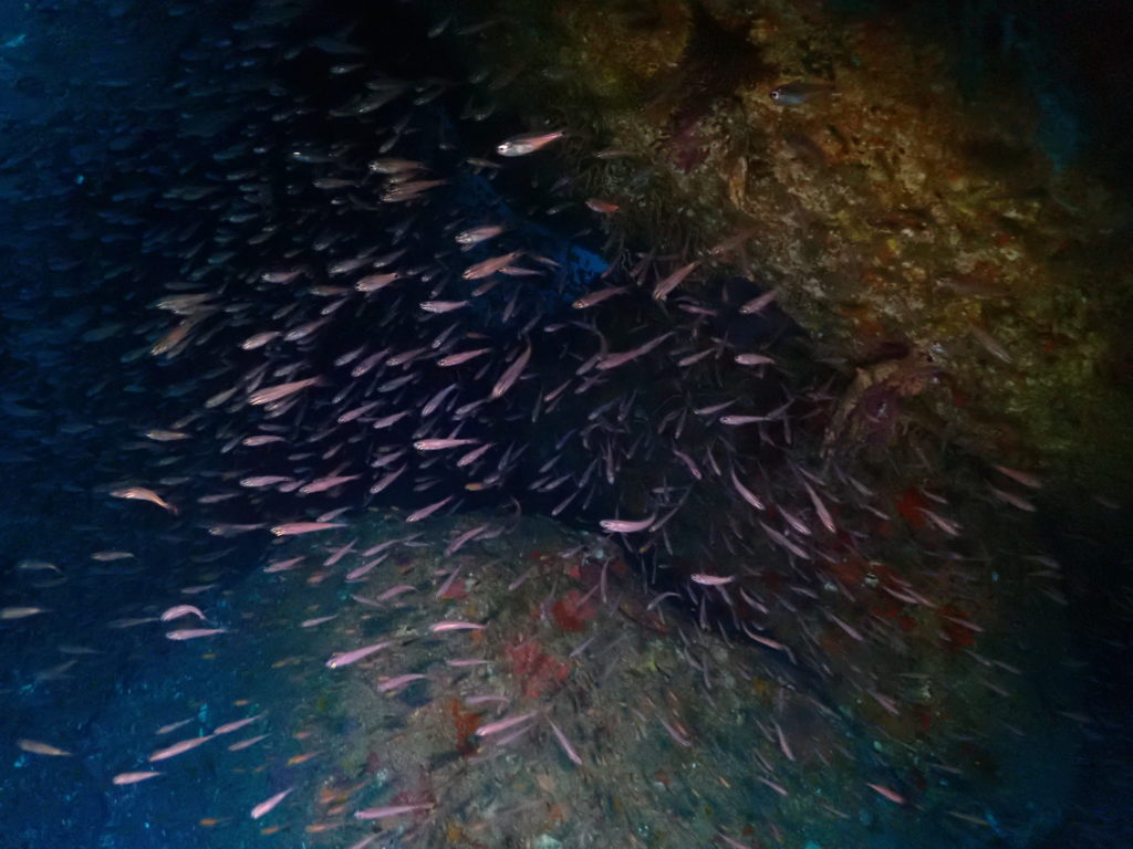 洞窟内ではネンブツダイやクロホシイシモチも加わり、