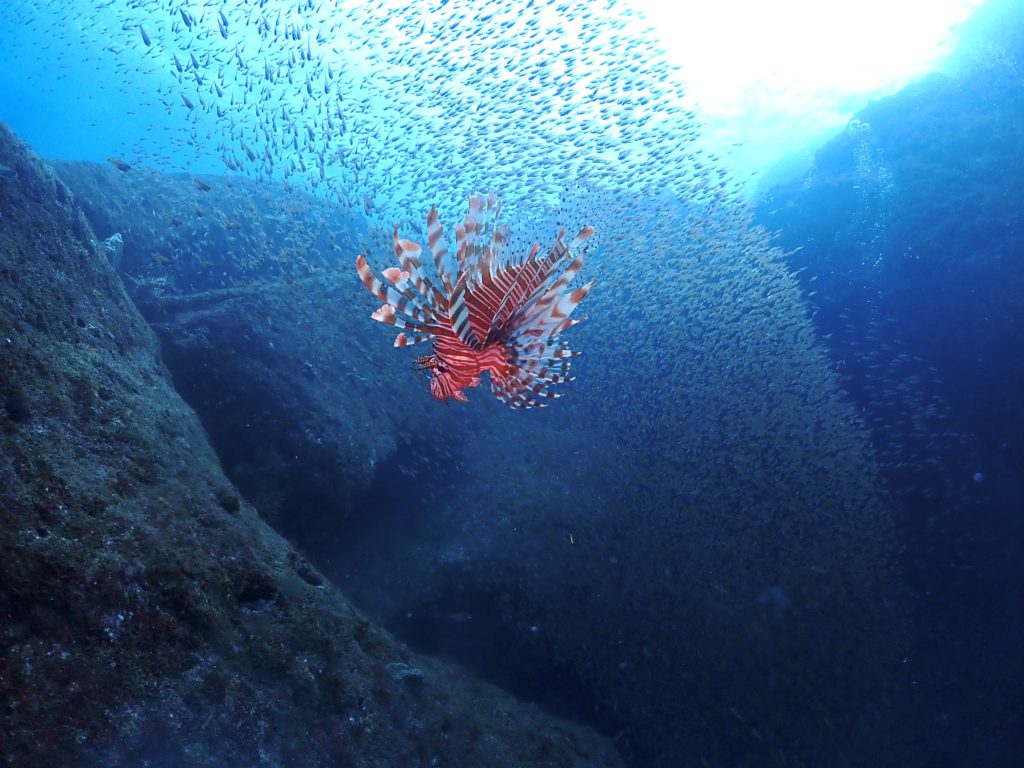 最後に、帰り道で群れの中にミノカサゴを発見。
