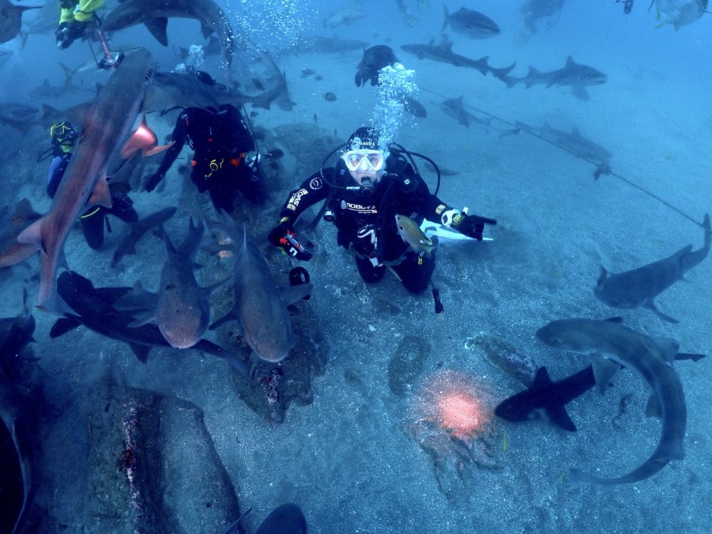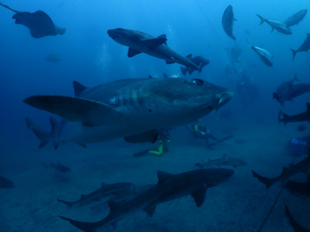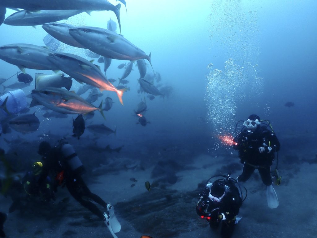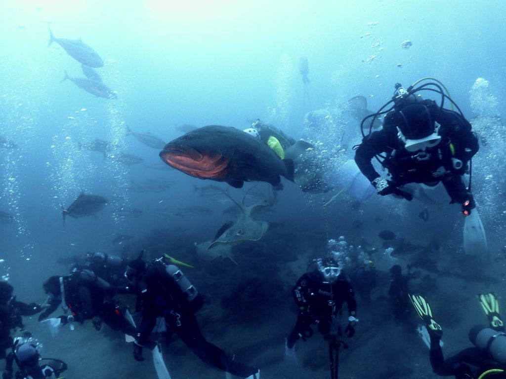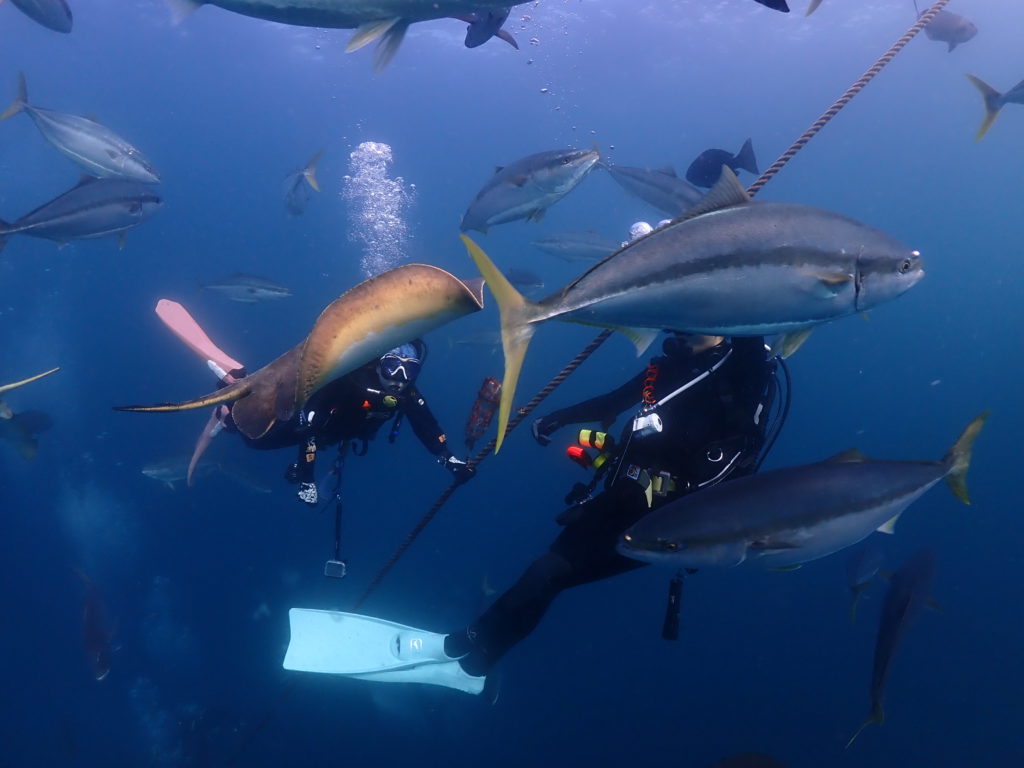 それを狙って集まるサメ、エイ、コブダイ、クエ、ヒゲダイ…